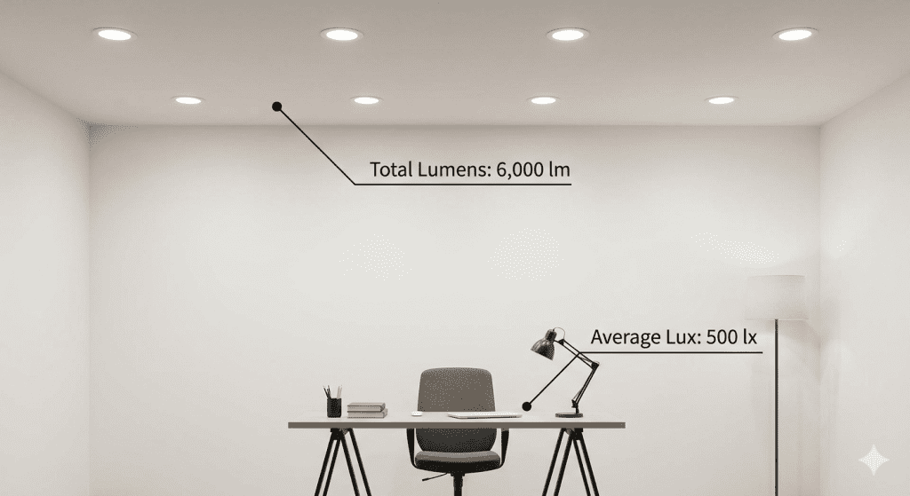 การเลือกซื้อ: หากเลือกใช้หลอดไฟดาวน์ไลท์ (Downlight) LED ขนาดหลอดละ 800 Lumens คุณจะต้องติดตั้งไฟทั้งหมด 6,000 / 800 = 7.5 หรือประมาณ 8 จุด เพื่อให้แสงสว่างกระจายทั่วห้องอย่างเพียงพอ