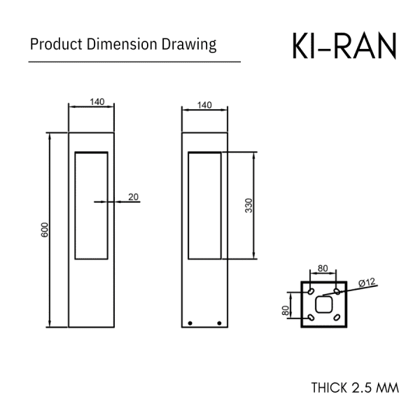 โคมไฟสนาม 60 CM KIRAN-BL012-12W-600 วัสดุอลูมิเนียมหนา 2.5 มิล แสงLED 12W สูง 60ซม. แสงวอร์ม 3000K WarmWhite วัสดุทนทาน อายุการใช้งานยาวนาน กันน้ำกันฝุ่น IP65