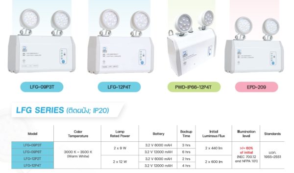 ไฟฉุกเฉินรุ่น LFG-09P3T (SD) LED2x9W แสงวอร์ม สำรอง 3ชม. แบตLifePO4 3.2V 6000mAH